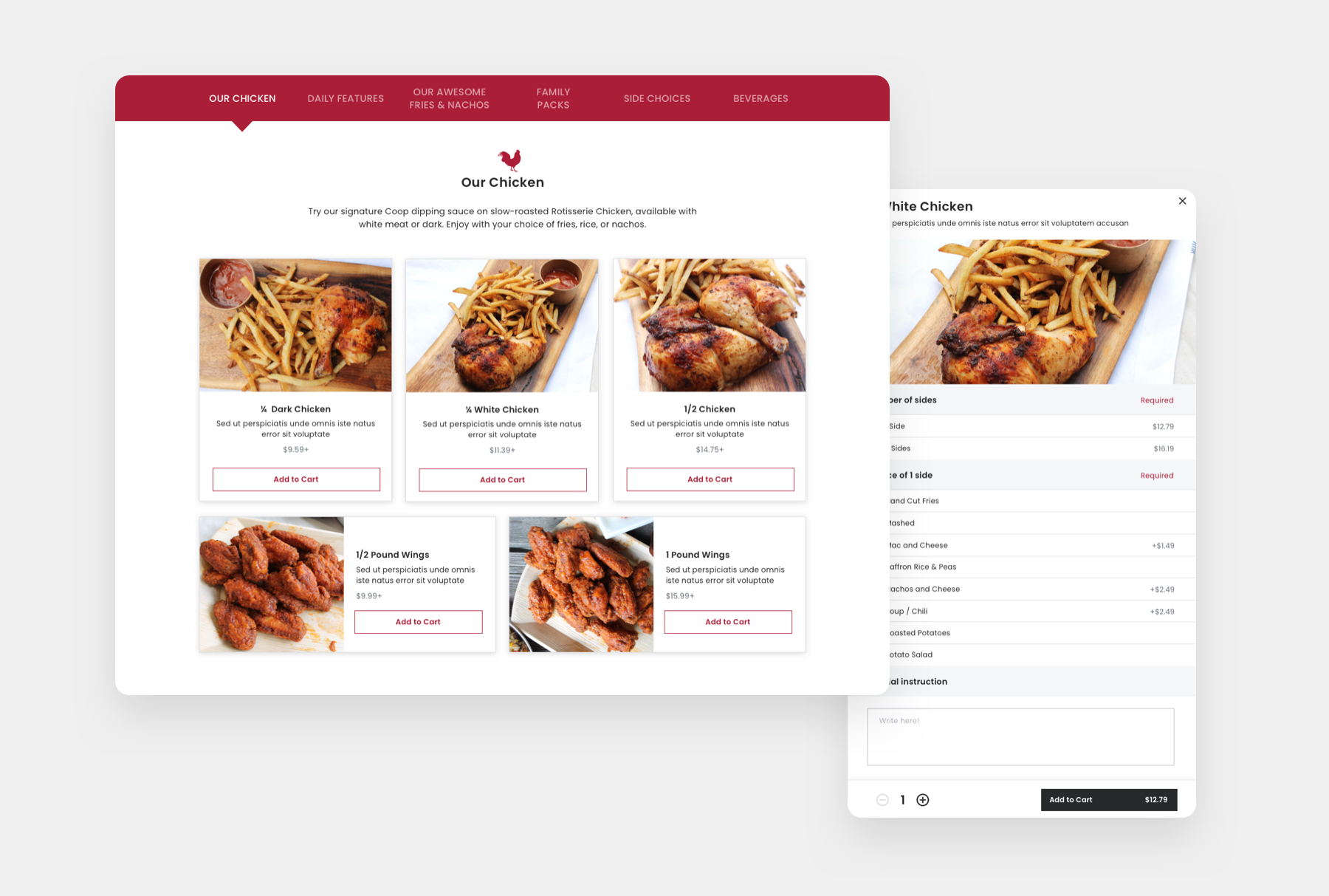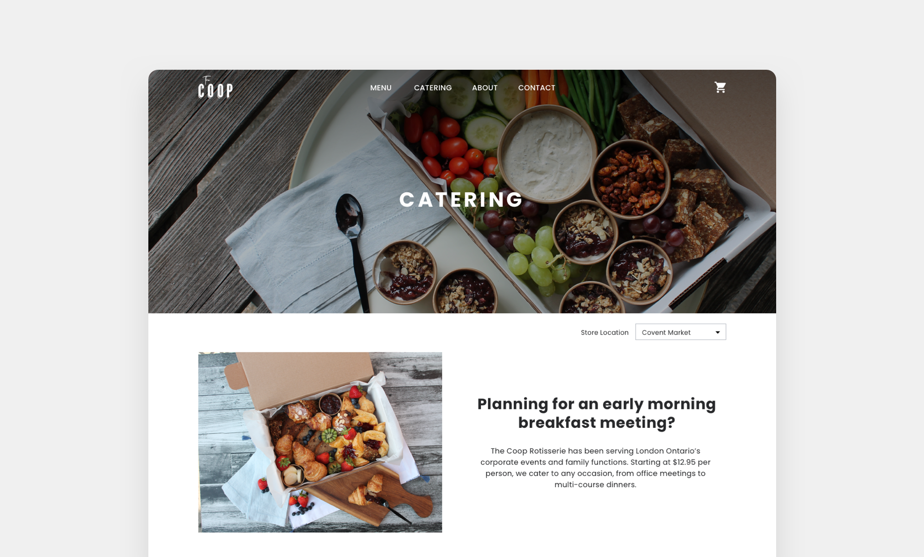 The Coop is a popular local restaurant in London, Ontario that serves fresh rotisserie chicken with a variety of delicious sides and desserts. Main goal of the project was to add online ordering capabilities and separating the regular menu and the catering to avoid confusion from the users.